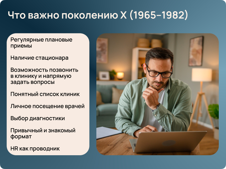 Итак, поколение тех, кому сейчас от 43 до 60. Оно называется Х и ему характерны надежность, классический подход к заботе, четкое донесение информации и стабильность.