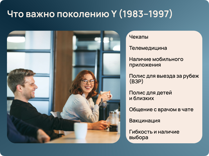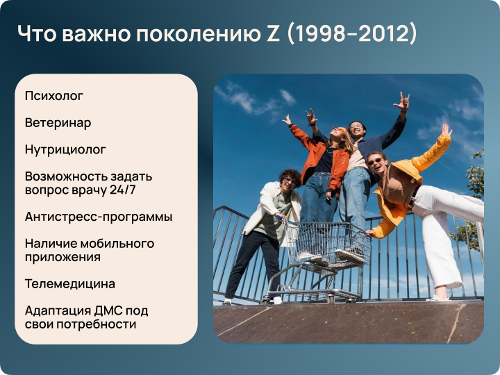 То, что устраивает 50-летних, не совсем подходит их отпрыскам при коммерческом медицинском обслуживании. Разница в воспитании, во взглядах на жизнь и привычках воплощается в желаниях вполне конкретных опций, о чем свидетельствуют наглядные слайды.