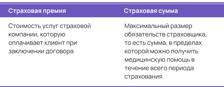 Пример: Арсений оформил полис ДМС для физического лица, внеся разовый взнос 50 450 рублей — это страховая премия. По условиям договора совокупная стоимость всех медицинских услуг клиник, в которые он будет обращаться в течение года при остром заболевании или обострении хронического, не может превышать 4 000 000 рублей — это и есть страховая сумма.
