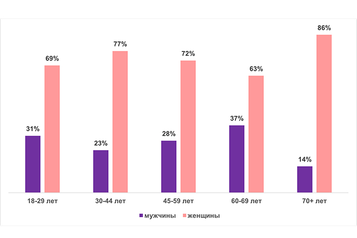 Интересный момент: во всех возрастных группах преобладают женщины, которые априори более серьезно, нежели сильный пол, относятся к своему организму и здоровью членов своей семьи. И во многом именно поэтому гораздо чаще, чем мужчины, пересекают 70-летний рубеж.